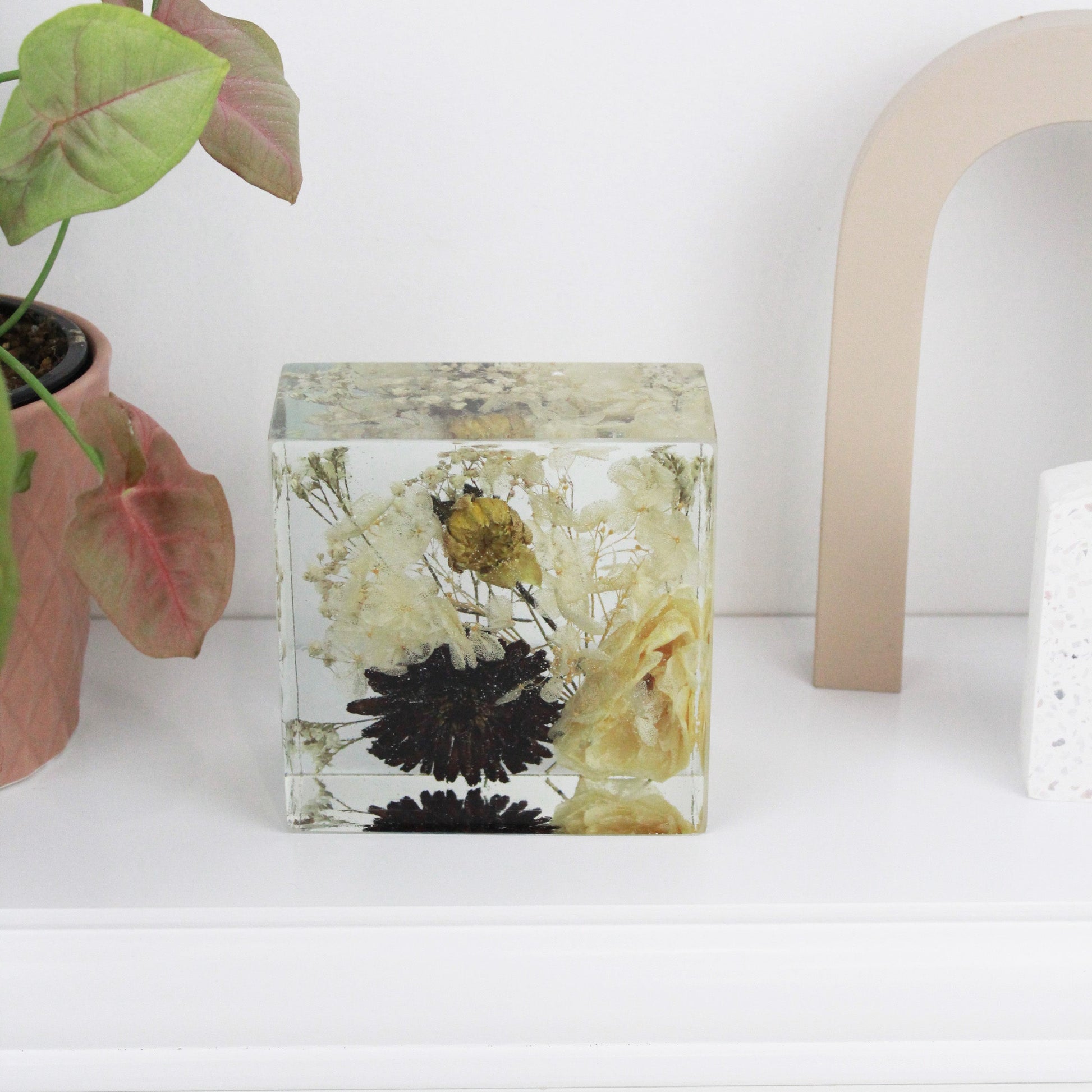 Delicately dried flowers preserved in layers of glass like resin. Each piece is hand made so no two will be the same.