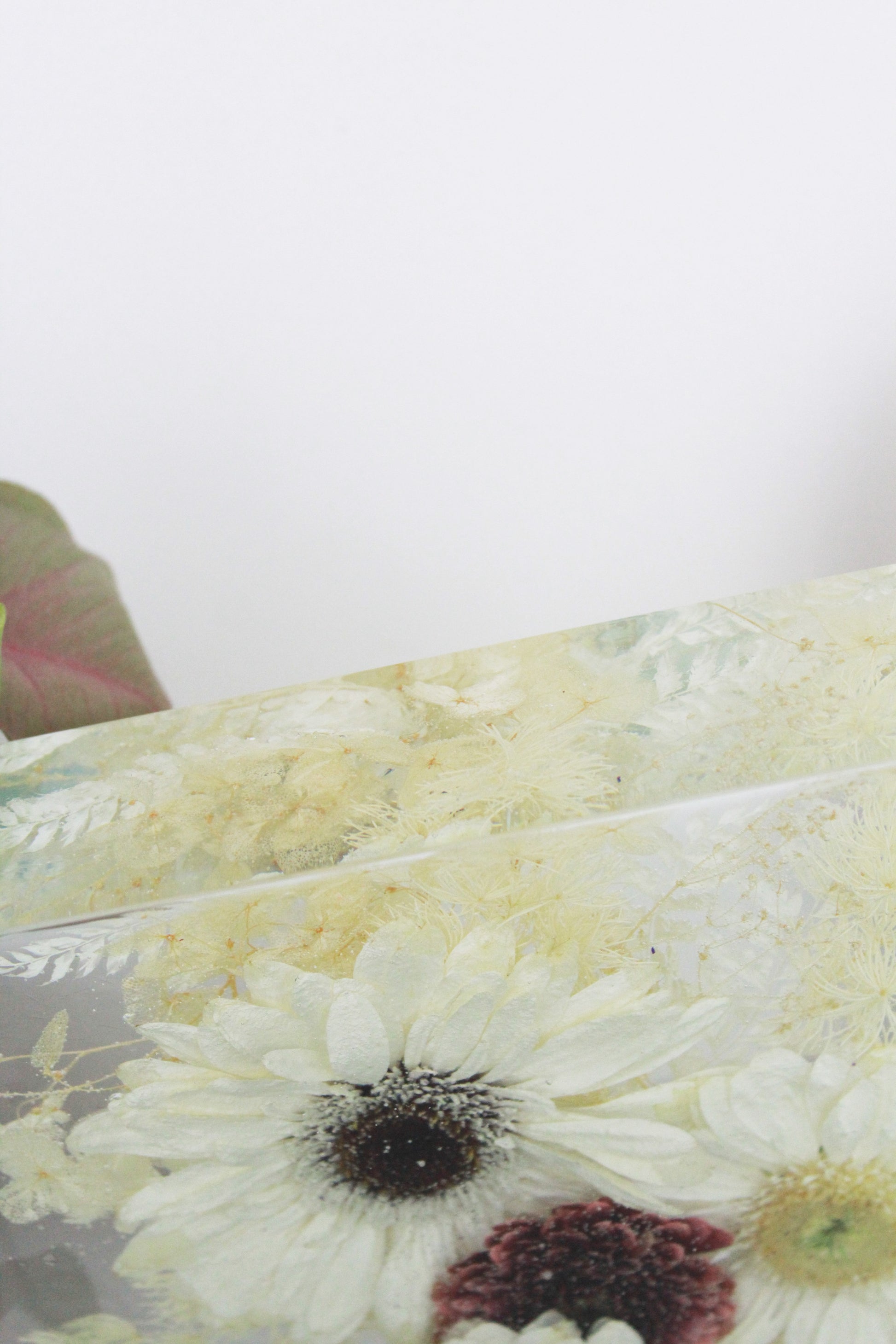 Delicately dried flowers preserved in layers of glass like resin. Each piece is hand made so no two will be the same.