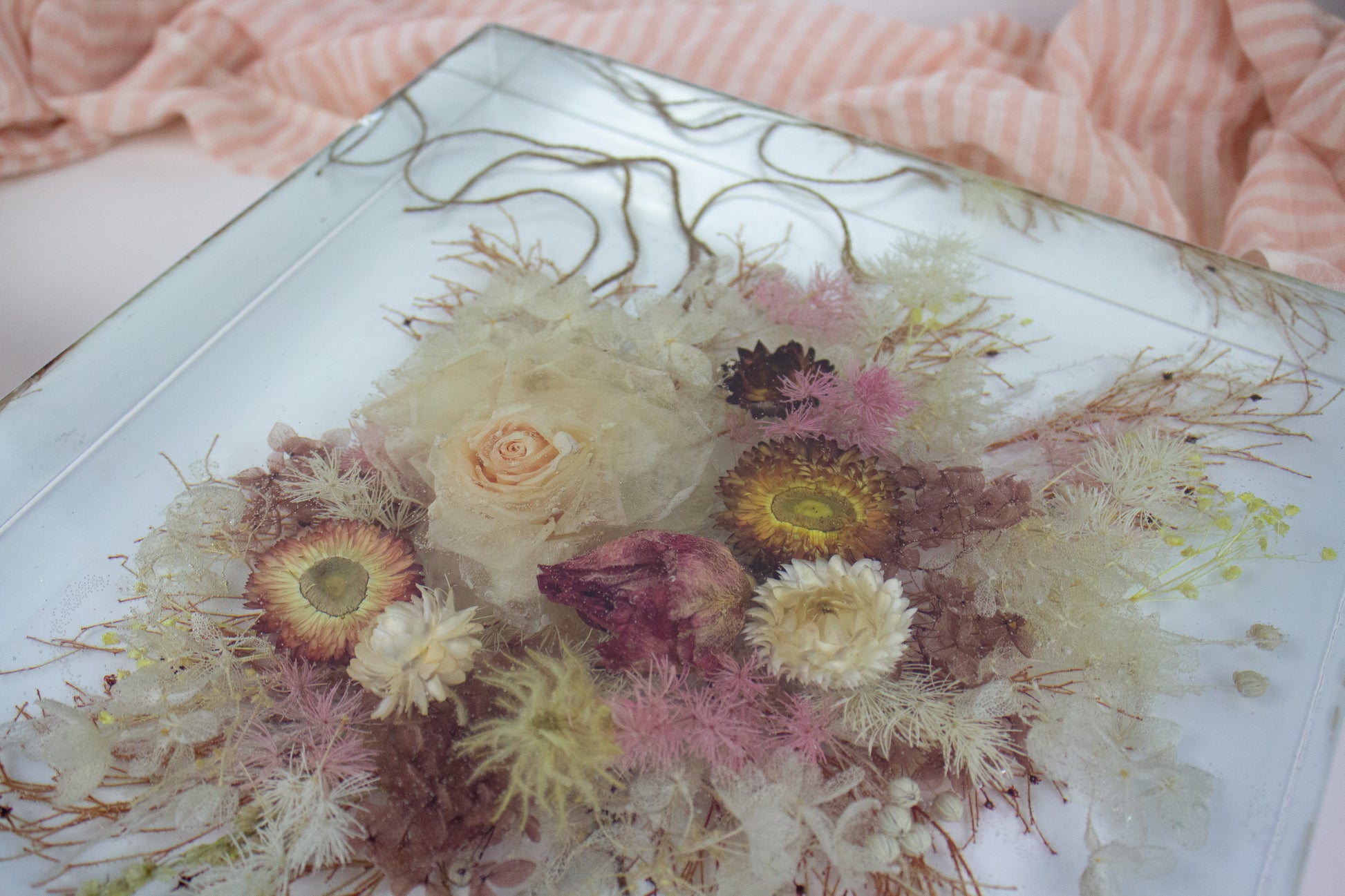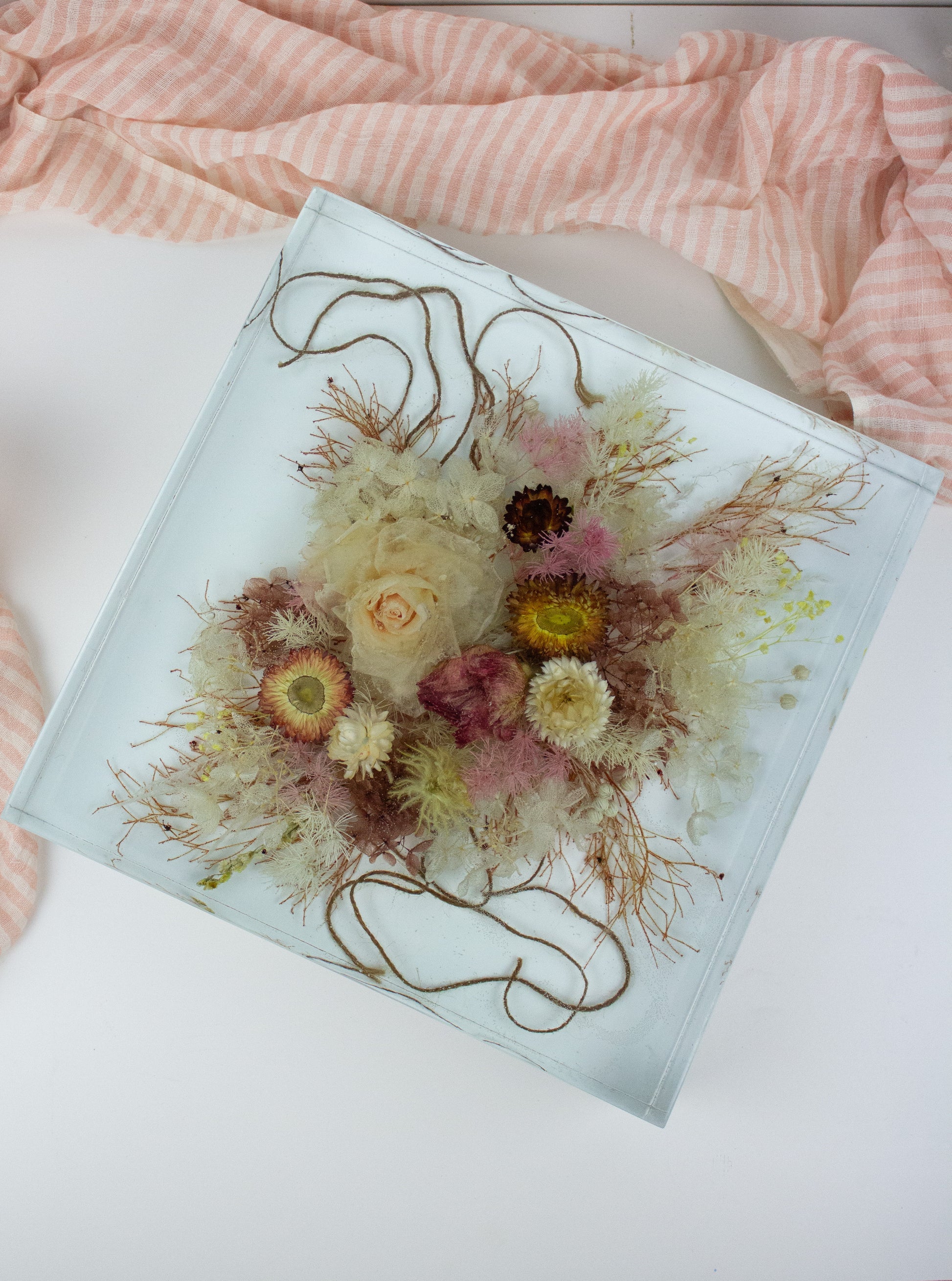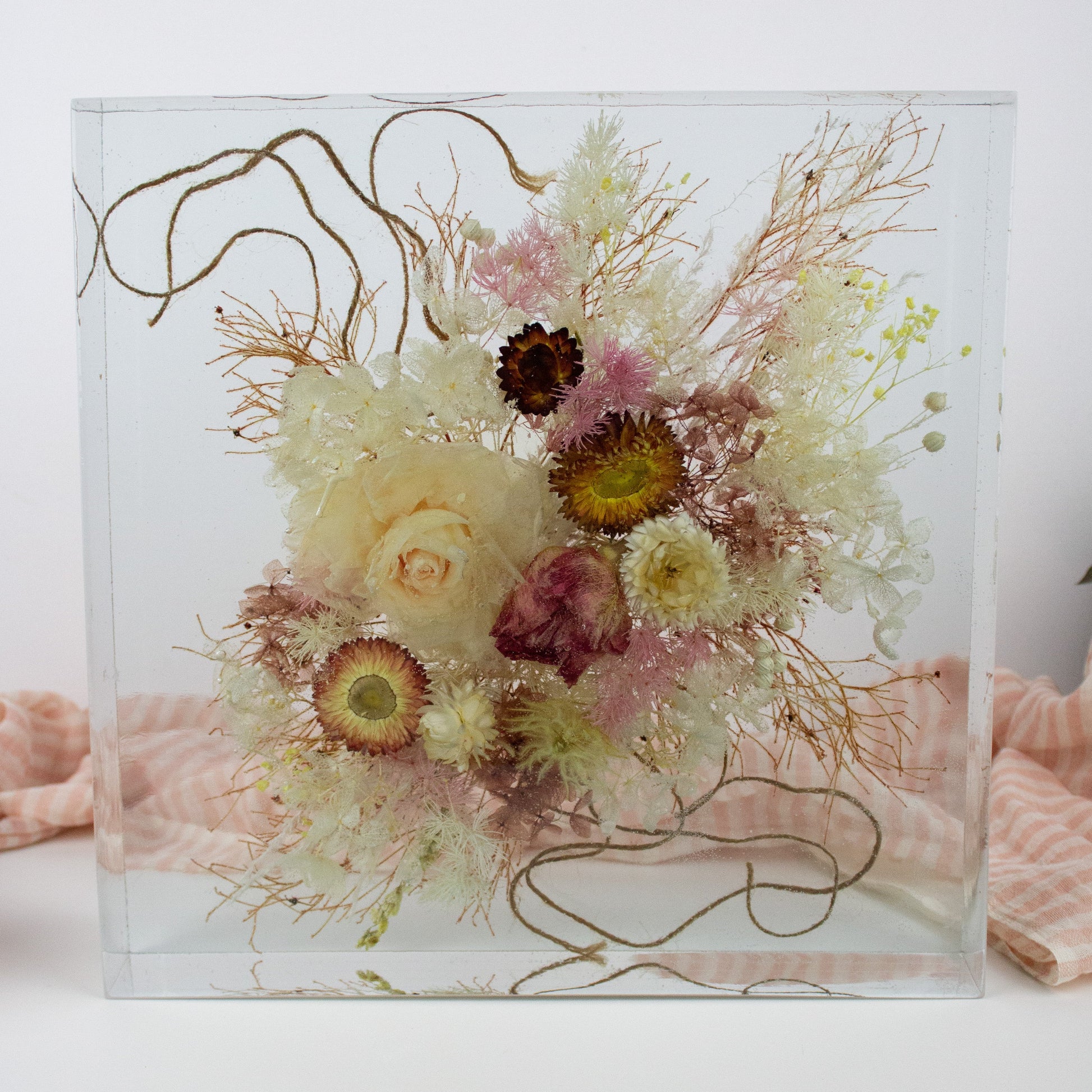 Delicately dried flowers preserved in layers of glass like resin. Each piece is hand made so no two will be the same.