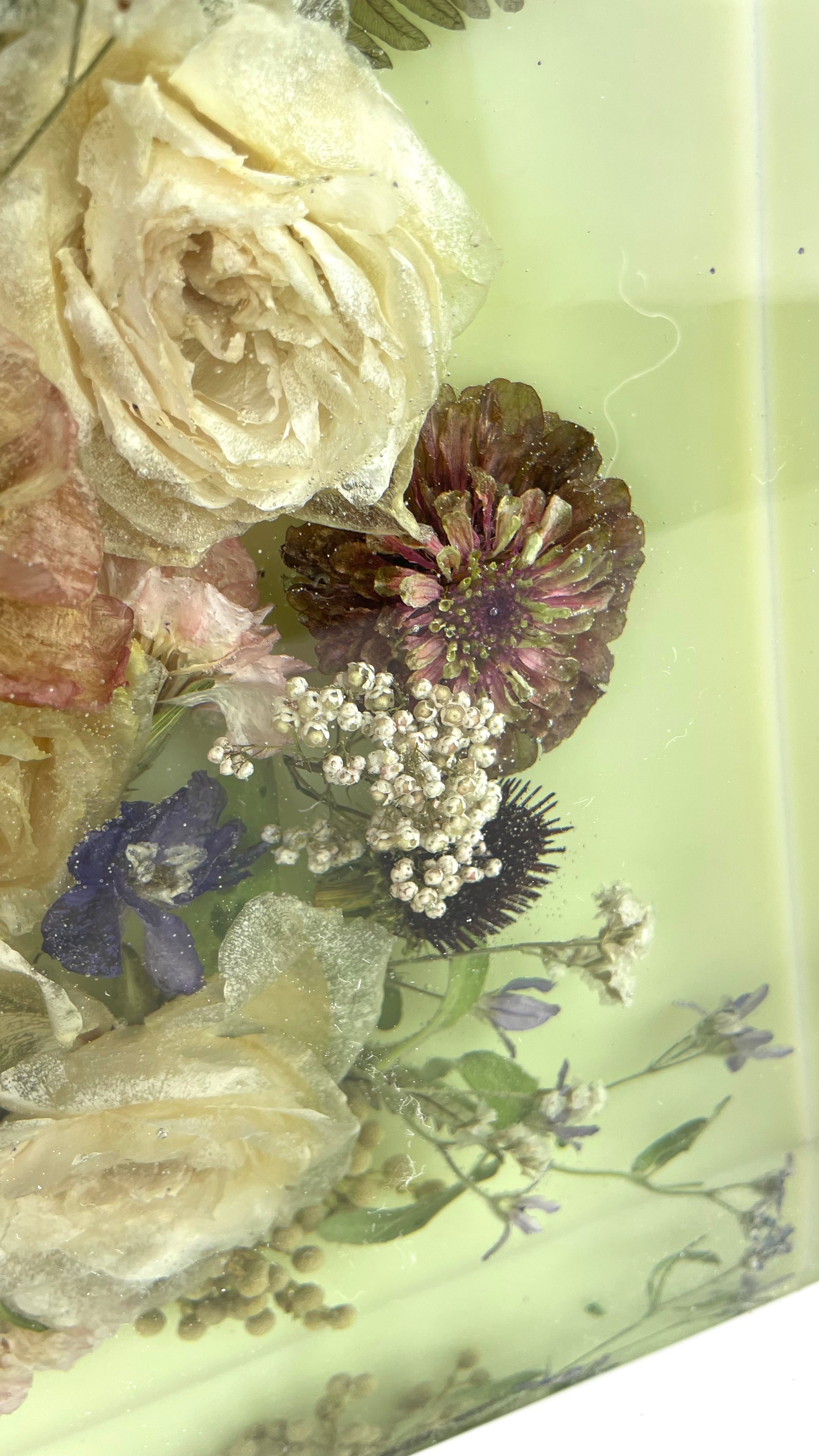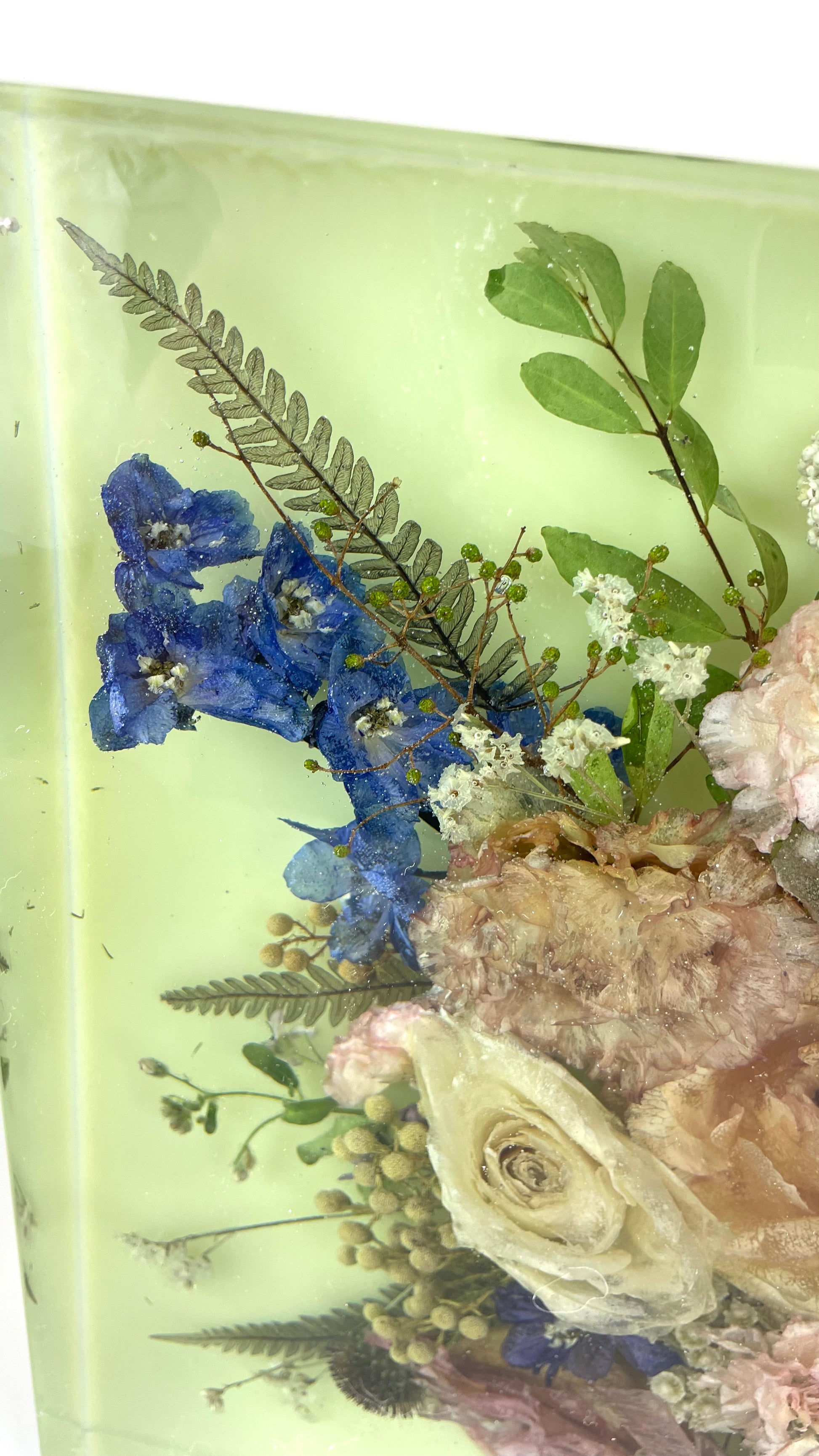 Delicately dried flowers preserved in layers of glass like resin. Each piece is hand made so no two will be the same.