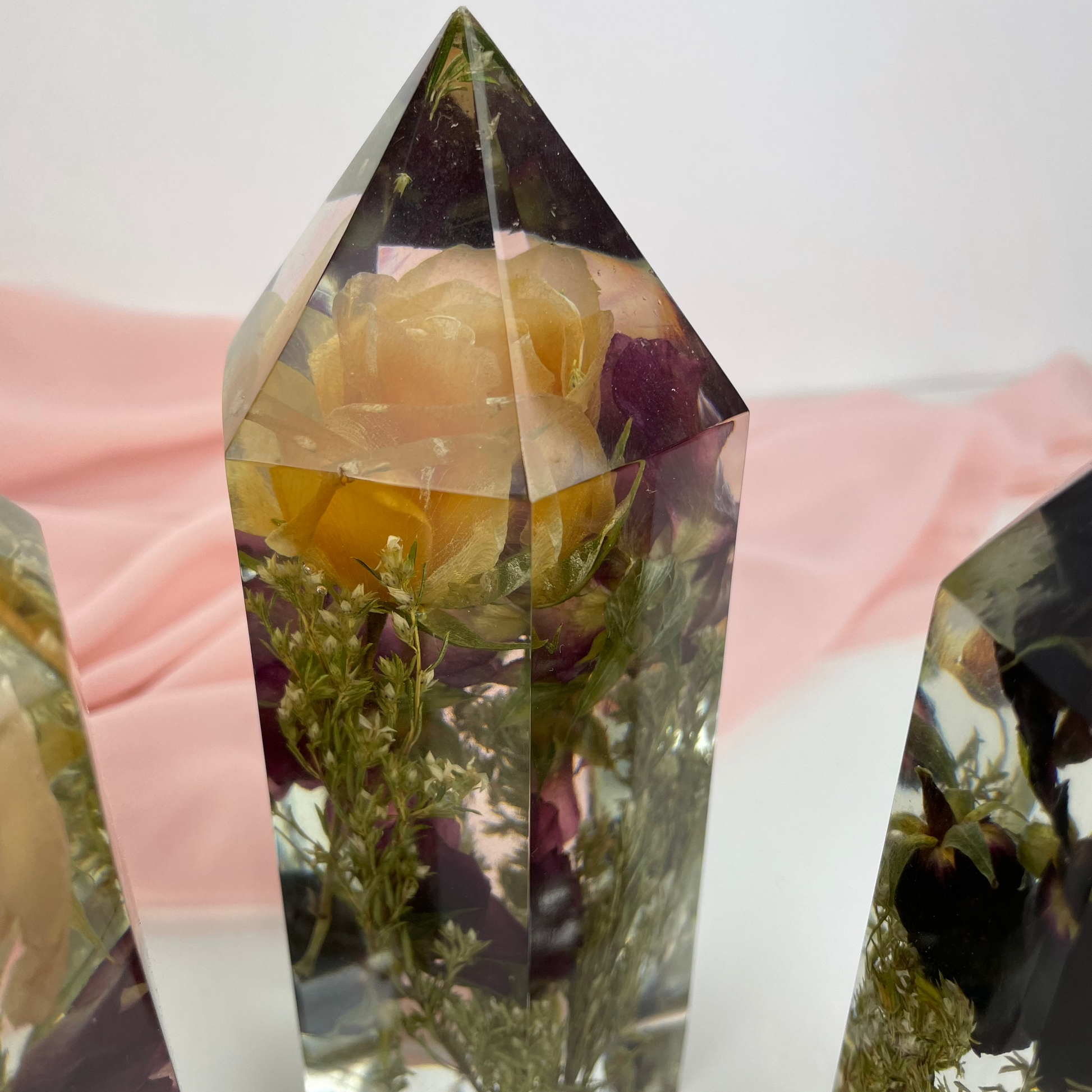 Delicately dried flowers preserved in water like resin in three different sized tower shapes. Each piece is different bringing a unique addition to your home décor, or a unique gift for  someone special, or hard to buy for.