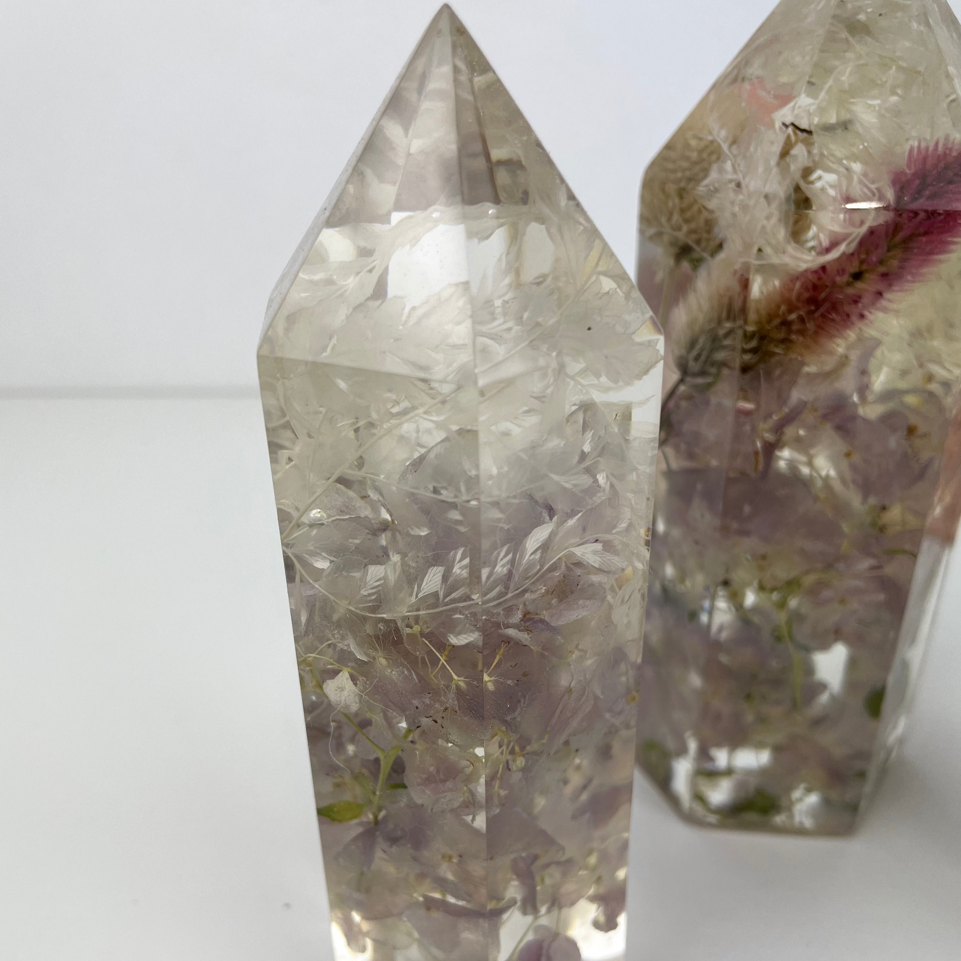 Delicately dried flowers preserved in water like resin in three different sized tower shapes. Each piece is different bringing a unique addition to your home décor, or a unique gift for someone special, or hard to buy for.