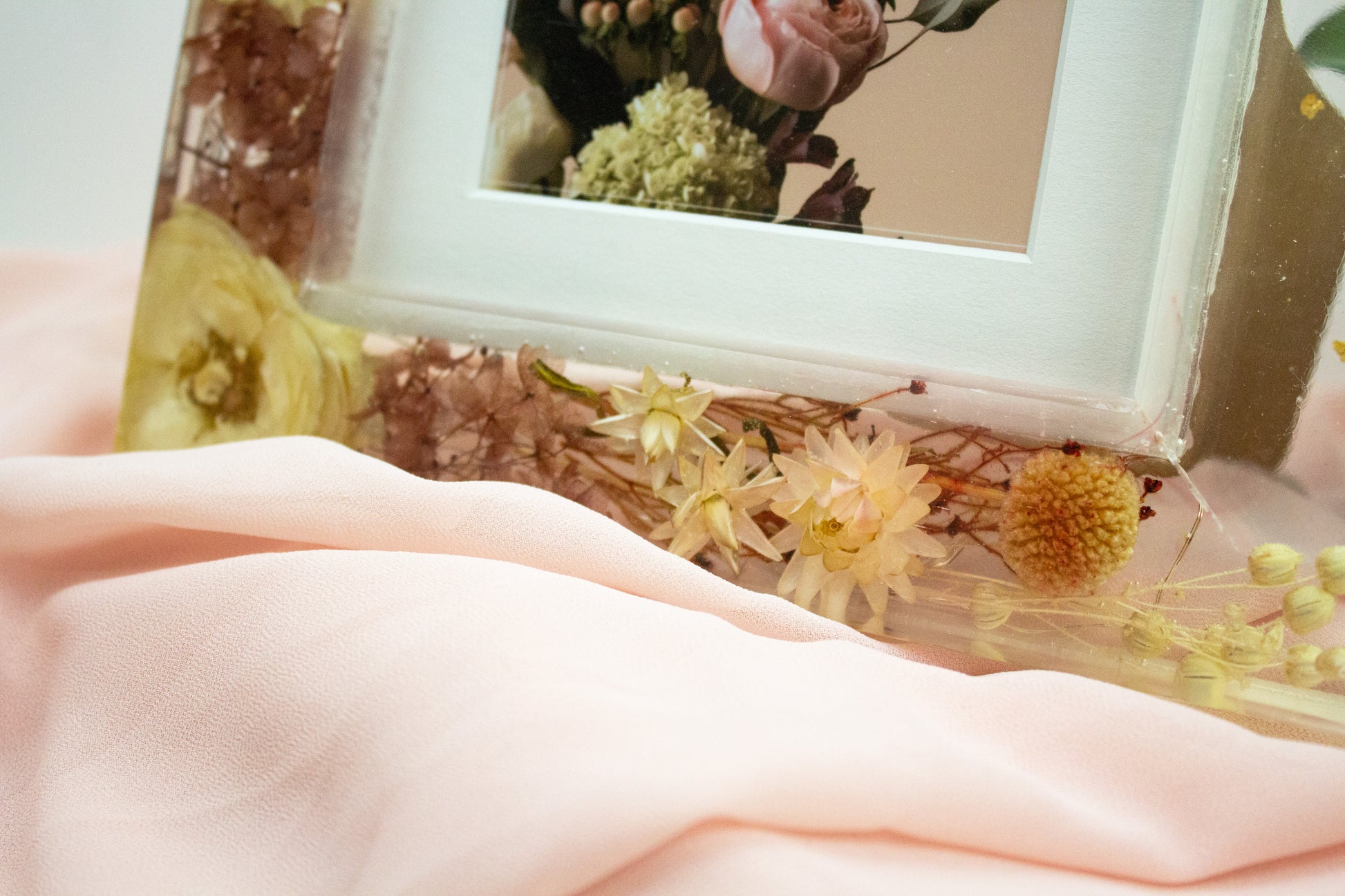 This gorgeous photo frame of clear resin features whole preserved flowers, and a cute little addition of some seed lights. Delicately dried, these flowers have held their colours during the drying process giving a special touch to a frame that would be the perfect gift, or a great addition to your decor.