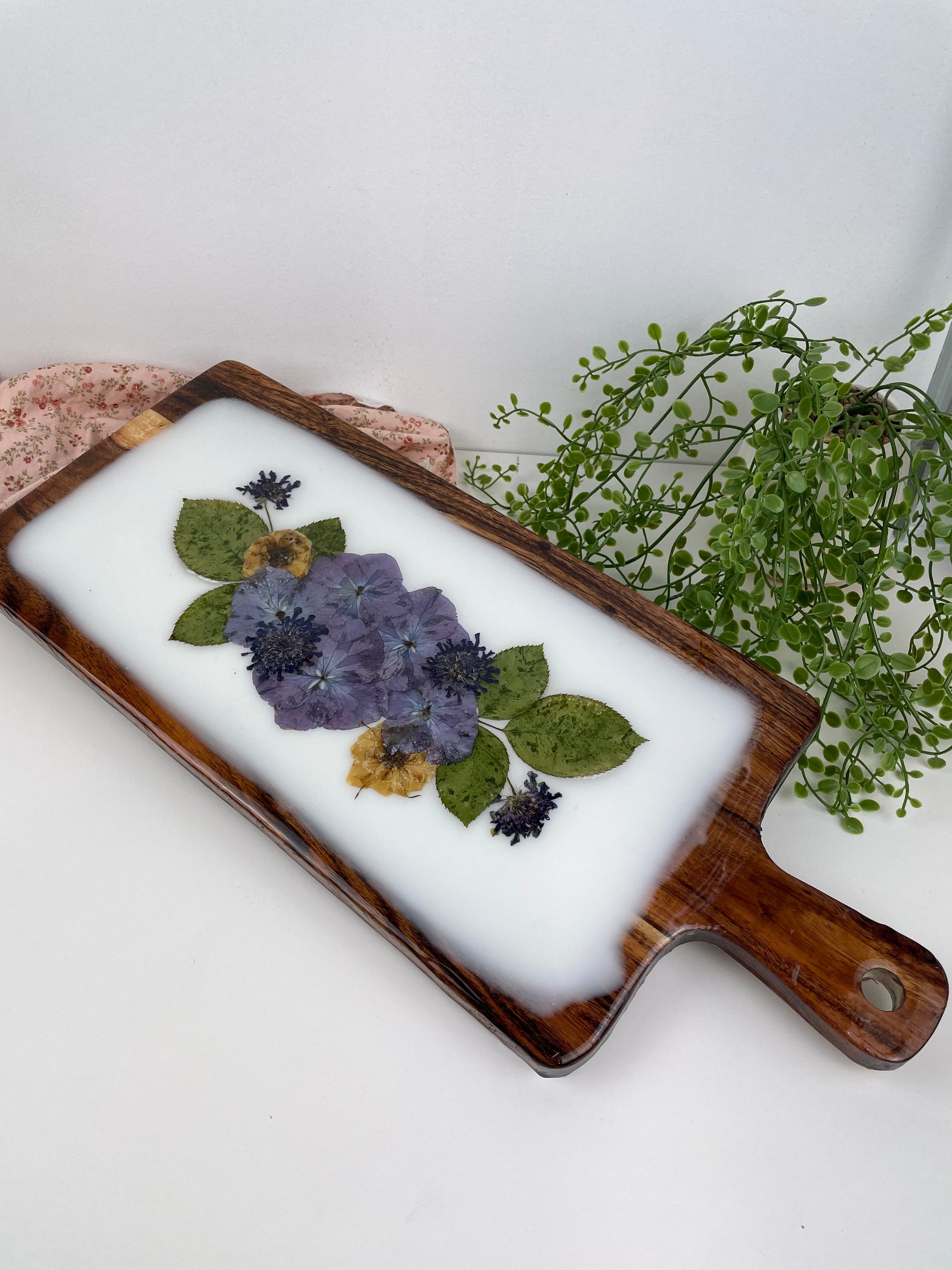 These are flat wooden boards decorated with pressed flowers and covered in resin. A gorgeous decor addition but also a useable addition to the kitchen. Check out the photos for the flower details.